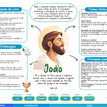 Explore cada um dos 73 livros da Bíblia de forma clara e estruturada, com resumos e elementos essenciais que facilitam o entendimento da Palavra de Deus.